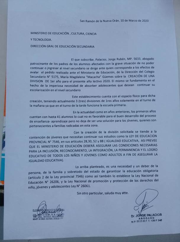 En representación legal con el Abogado Jorge Palacios, de los mismos a donoris "gestionamos e instamos mediante nota elevada al ministerio de educación a la creación de una nueva división y solicitamos mas docentes para cubrir el cargo que ya se encuentran asignados en dicho establecimiento. Nuestro fin es evitar el abandono escolar de los jóvenes y concluyan su estudio secundario con total igualdad educativa, apelamos hacer cumplir la ley de educación provincial n° 7546, la ley nacional de educación n° 26206 y la ley de promoción y protección de los niños, jóvenes y adolescentes ley n° 26061" sostuvo en dialogo con Radio Cadena NOA.